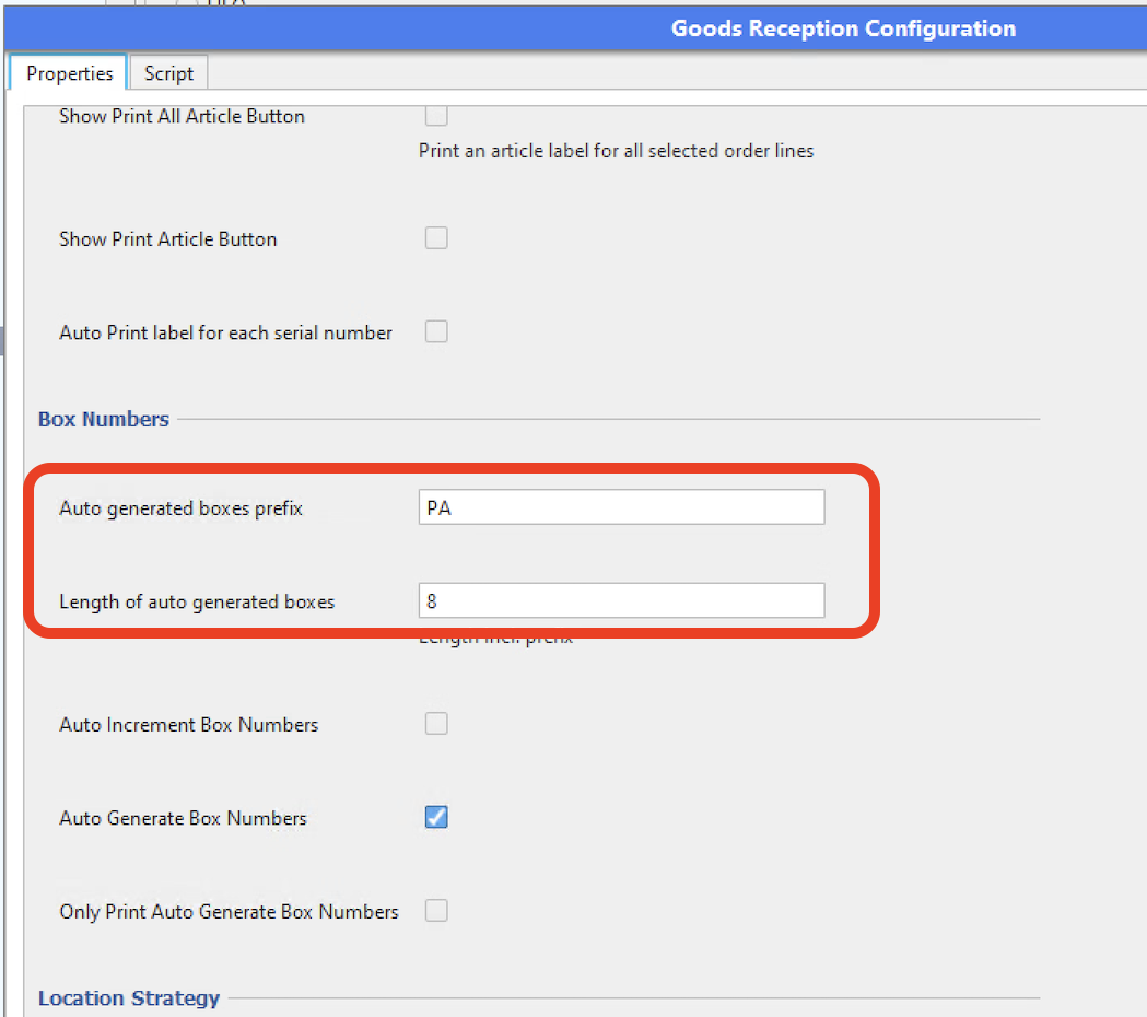 Auto generated container and box numbers can be configured to have a prefix and a starting number. Container numbers are used at many places in SHARK, for handling articles in boxes, pallets, etc.